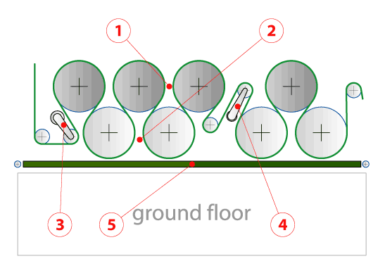 Part of the slate or sand surface finishing not really stick on membrane has to be moved off. The membrane is complete finished when reaches this section and the last operation is a strong cooling. The ten driven rollers (940 mm Diameter) made by a thin stainless steel covering warrant a high exchanging with the membrane surface. For anti shock reason, the section in divided in two part by a dancer roller.